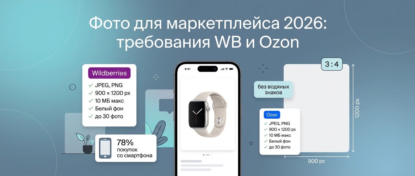 56% покупателей смотрят фото первым делом. Требования к фото для маркетплейсов WB, Ozon, Яндекс Маркет: размеры, форматы, фон и частые ошибки.